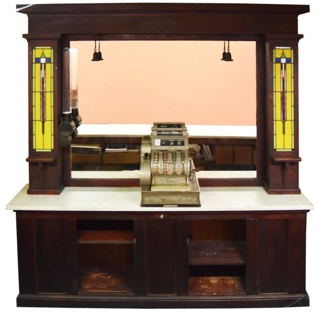 With stained glass insets. Register not included. Measures: 96" x 95" x 16" Bar will separate into 2 pieces, the top and the bottom. Located upstairs in rear building.