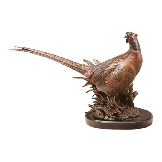 Wonderfully detailed and handsomely finished representation of a Pheasant. Composed using Big Sky Carvers' proprietary "Montana Bronze" process, which blends pewter and bronze with fine resins, finished with metallic paint and hand-applied patinas for a distinguished and aged look. Pheasant sculpture measures 18"W x 10?"H
