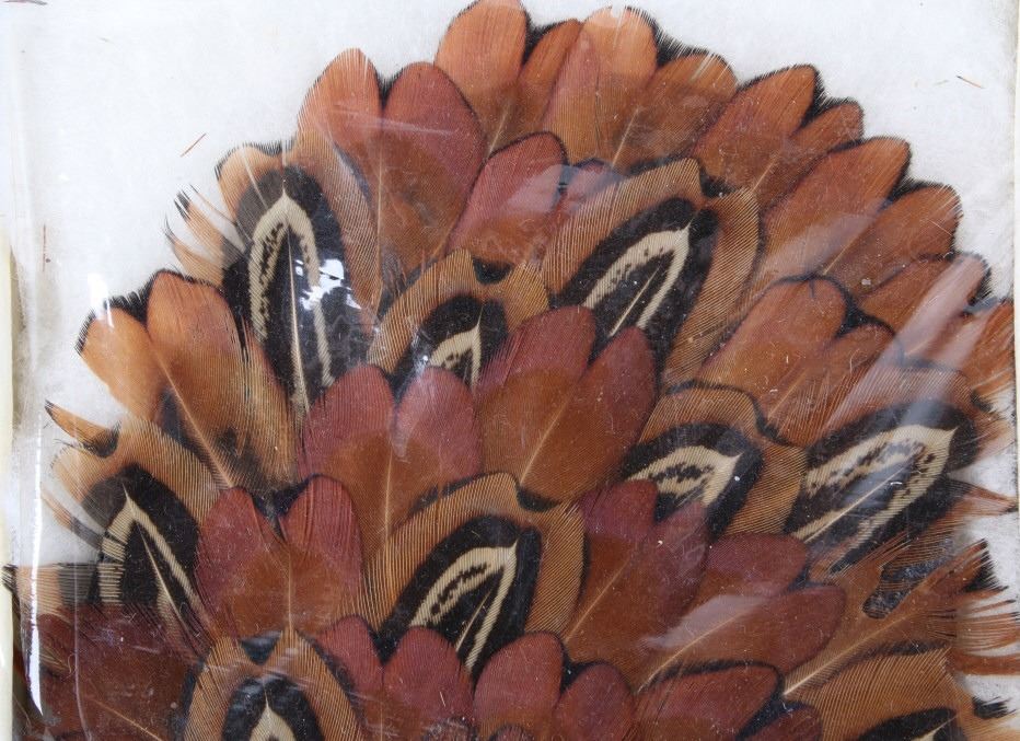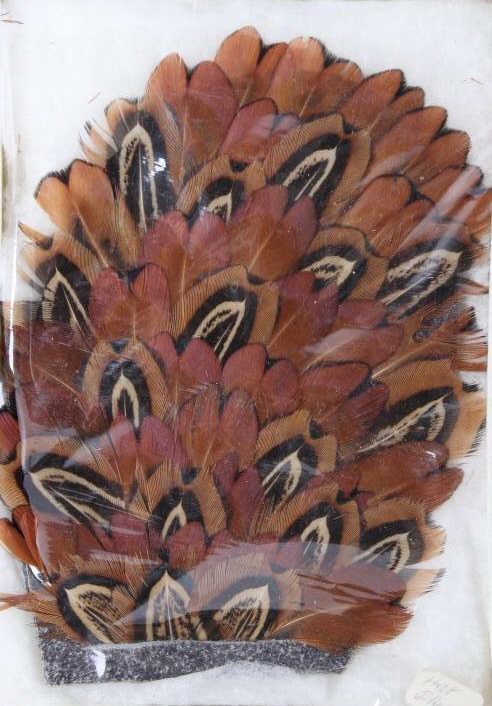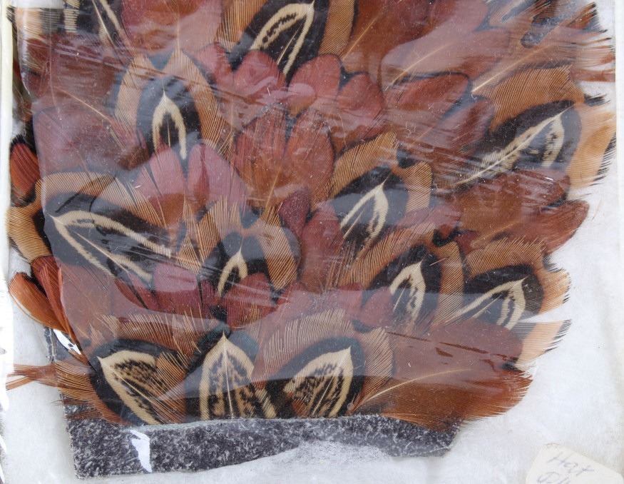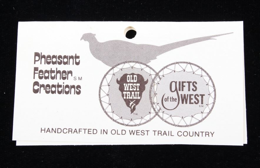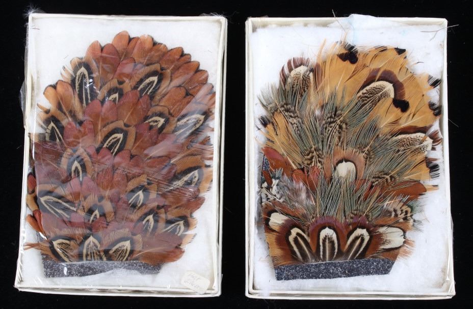 Featured in this lot are handmade pheasant feather hat plumes with the original boxes. The hat plumes display pheasant feather construction with leather backing and two pins. The feathers display wonderful brown and tan coloration. Each hat piece comes with its original box and "Gifts of the West" tag. The plumes measure 4 1/2" tall by 3 1/2" wide.
