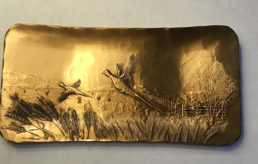 Pheasants in a field hammered forged bronze tray. 10" W X 5" H. Stamped Wendell August Forge on the reverse.Â