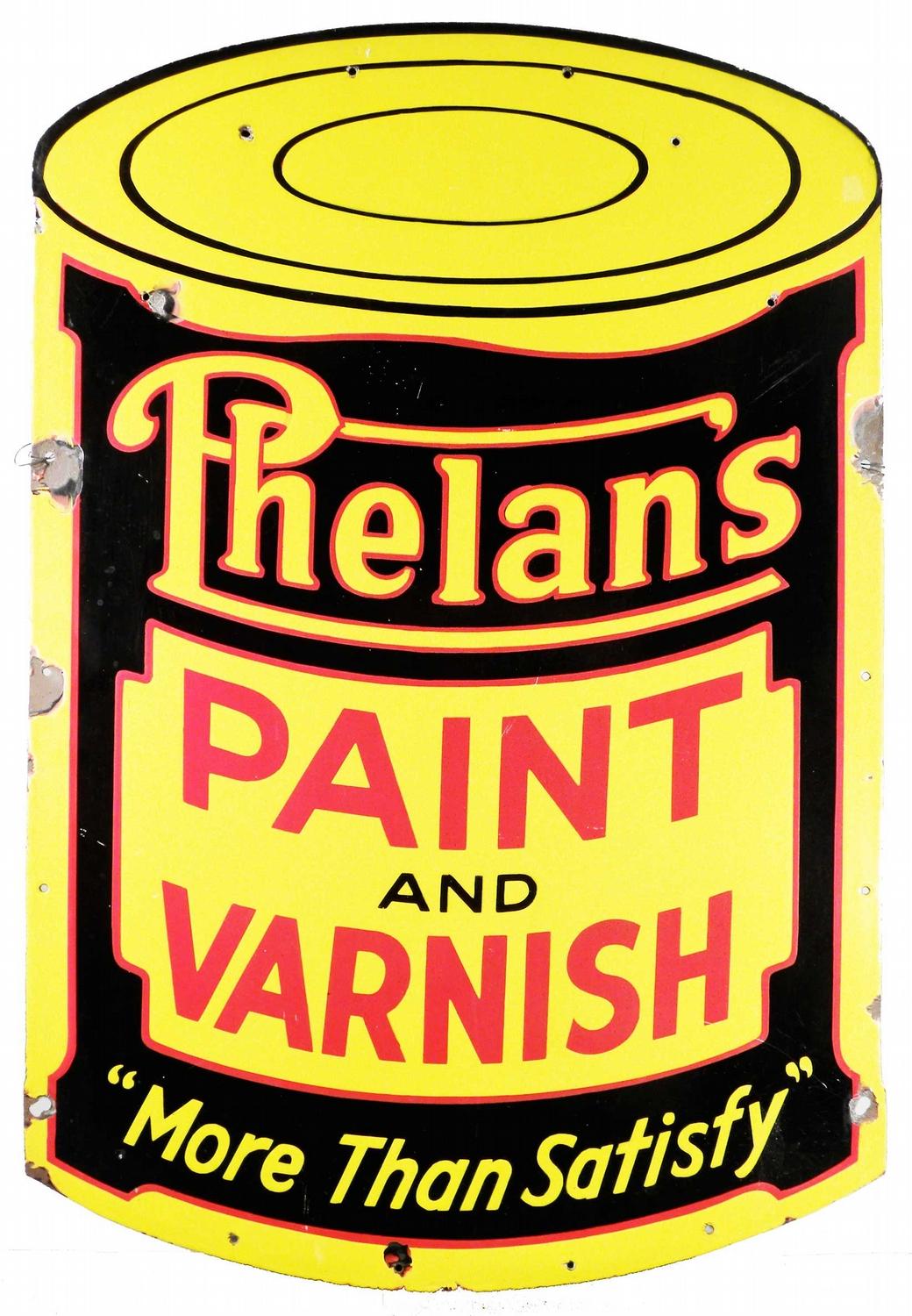 Phelans Paint and Varnish Die Cut Porcelain Sign. Chips around the edges and one above the "P" otherwise very good condition. 24 X 35inches.