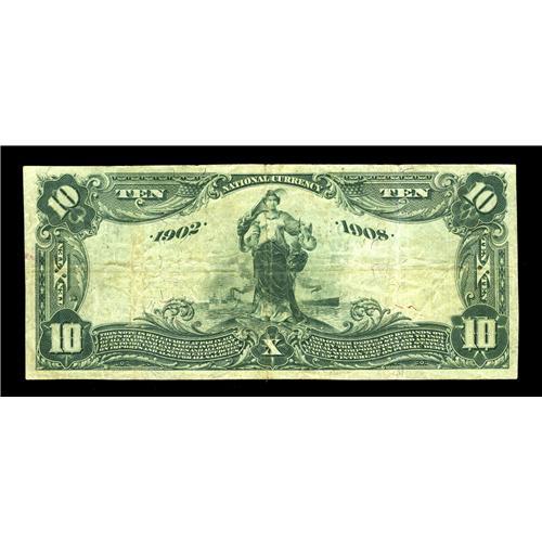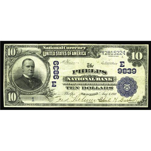 <B>Phelps, NY</B></I> - $10 1902 Date Back Fr. 619 <B>The Phelps NB</B></I> Ch. # (E)9839<BR>This is the only number 1 note known from this very hard to find Ontario County bank, and is new to the census, having just been discovered and made available to the numismatic community for the first time. The margins are trimmed a bit close all around, but the note is otherwise utterly unmolested and the look is that of a higher grade piece. Pen signed <B>Fine-Very Fine.</B></I>