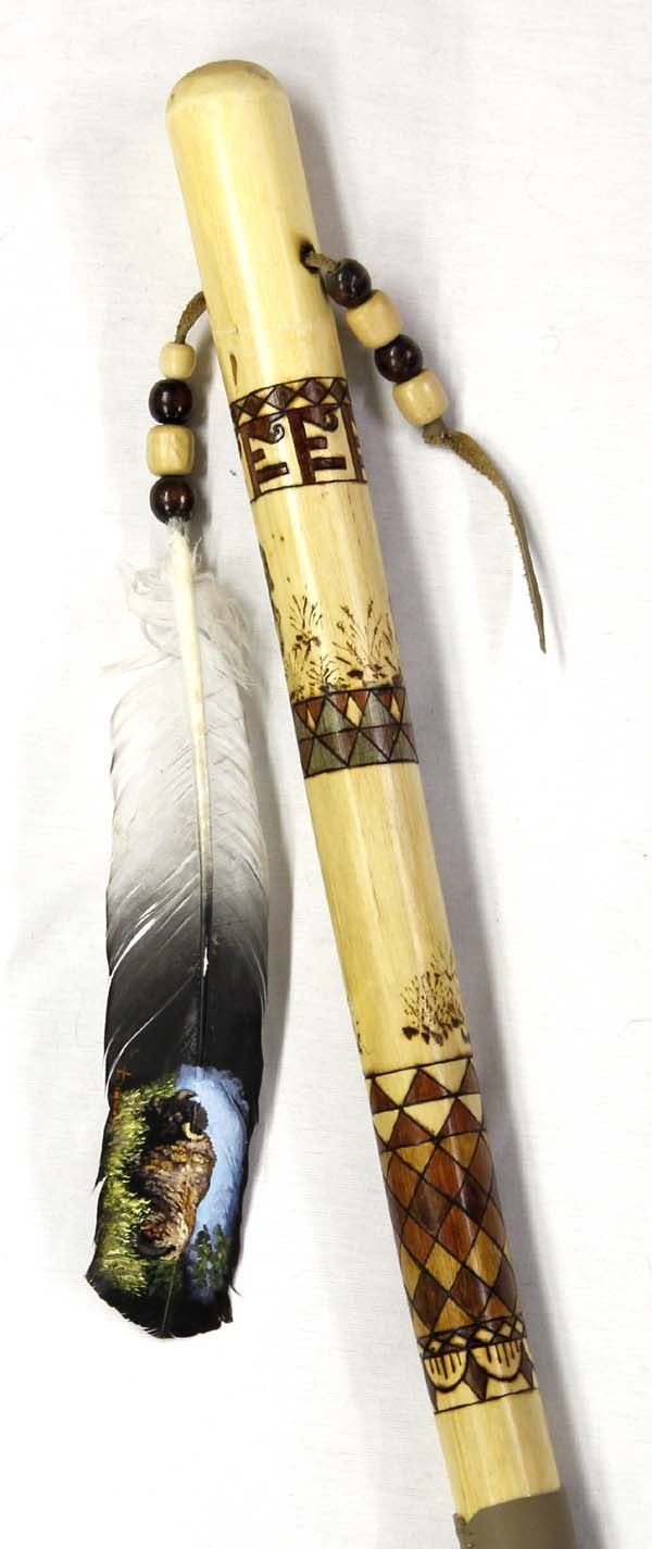 2015 Phenomenal Hand Crafted Walking Stick by T. Chango of Deming, New Mexico, measures 2''W x 62''L, beautifully wood burned designs and pictures, hand painted and varnished, embellished with wood beads, leather, and a gorgeous hand painted feather (buffalo), has leather hand grip and rubber tip on bottom end, features buffalo and deer designs, signed by the artist, Well executed and truly a work of art!