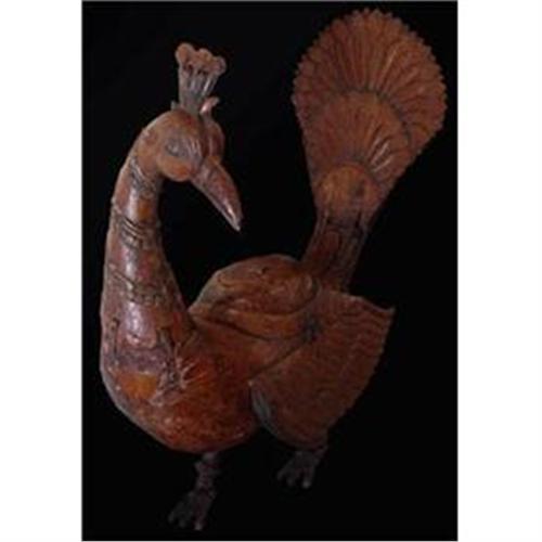 This Polychrome Indian Sculpture of a Sacred Peacock is in Excellent Condition, c.early 18th century.This hand carved wood sculpture holds significant meaning in Hindu religious practice. It was originally placed inside a temple in India. The peacock, besides being the national bird of India, is known as the mount of the Lord of War, Subramanya (also known as Skanda), the son of Shiva and his consort Parvati. Riding a peacock signifies that Subramanya conquered pride, egoism, and vanity. The cobra at the feet of the peacock symbolizes fearlessness and immortality. Subramanya is credited with vanquishing the demon Taraka. This triumph is celebrated every November on Skanda Sashti. Measuring 27? D x 54? W x 67? H. Please view all pictures to enjoy, serious inquiries are welcome!