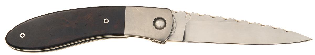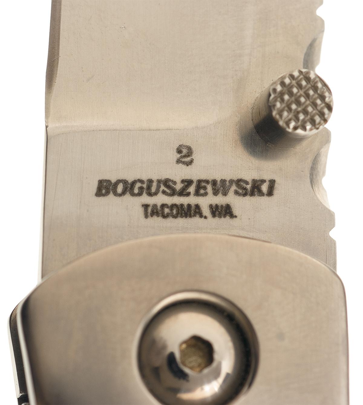 This Number 2 folding knife was fabricated by Washington state knifemaker Phil Boguszewski who specializes in folding knives. The blade is 3 5/8 inches long and marked "2 / BOGUSZEWSKI / TACOMA, WA.", with the spine having an artful filed pattern. Fitted with nicely figured hardwood scales secured with two rivets. OAL: 8"