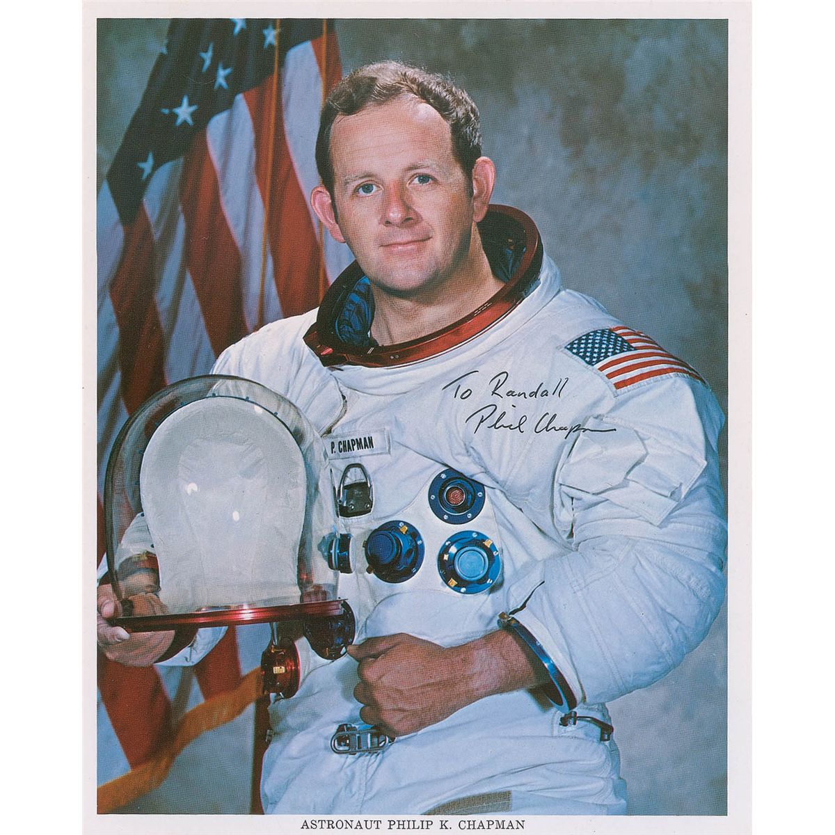 First Australian-born American astronaut (b. 1935) who spent five years in NASA Astronaut Group 6. Scarce color 8 x 10 NASA photo of Chapman in his white spacesuit, signed and inscribed in black felt tip “To Randall, Phil Chapman.” In fine condition, with a light crease to the upper left.