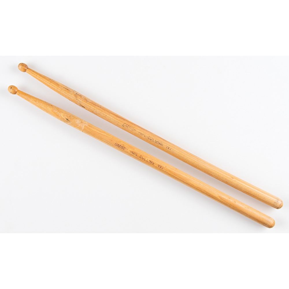 Pair of Phil Collins Gretsch Signature model drumsticks, 14.75Àù in length, attested to have been stage-used by Collins during a Genesis concert. The consignor notes that the sticks were originally obtained by a Genesis band assistant and roadie. In fine condition, with expected wear from use. Accompanied by a certificate of authenticity from Tracks.