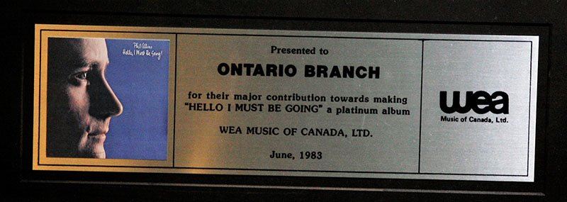 Phil Collins Framed Platinum Record Hello, I Must Be Going - Award Presented to Ontario Branch