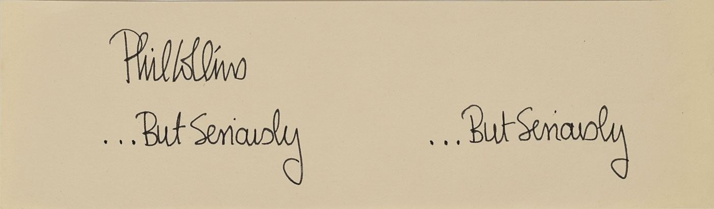 Handwritten lyrics to Collins's worldwide smash hit song ‘Another Day in Paradise,' one page, 9.25 x 11.5, signed in black ink on a separate off-white 9.25 x 2.75 slip, "Phil Collins…But Seriously, …But Seriously." ‘Another Day in Paradise’ was Collins’s seventh and final Billboard Hot 100 number-one single, the last number-one single of the 1980s, and the first of the 1990s. It won Collins the Grammy Award for the 1991 Record of the Year, and was nominated for Song of the Year, Best Pop Vocal Performance, Male, and Best Music Video, Short Form. It also won the Best British Single award at the 1990 Brit Awards.