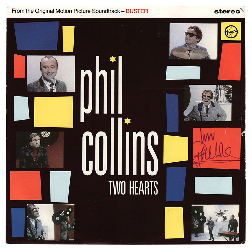 Virgin Records 45 RPM record for the Phil Collins single ‘Two Hearts / The Robbery,’ signed on the front cover in black ink, “Love, Phil Collins.†In fine condition. The record is included. Accompanied by a certificate of authenticity from Tracks.