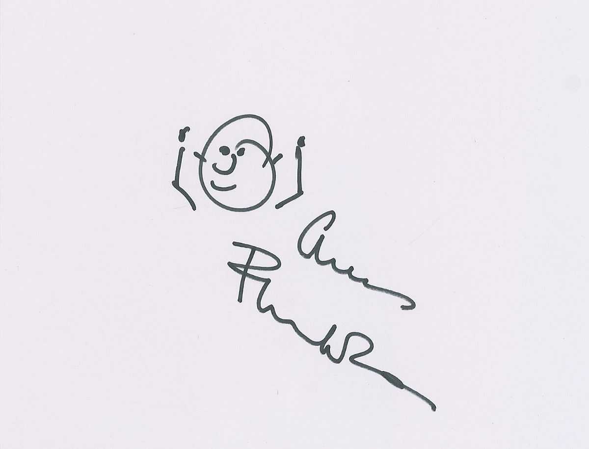 Felt tip signature, “Cheers, Phil Collins,” adding a small sketch of himself with raised drumsticks on a white 11 x 8.5 sheet. In fine condition.