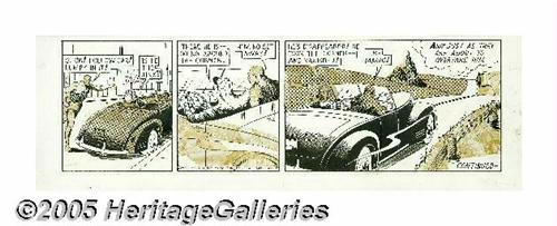 <B>Phil Davis - Mandrake the Magician Daily Comic Strip Original Art, dated 7-6-46 (King Features Syndicate, 1946).</B></I> On the trail of the Jinx, Mandrake the Magician's comrade, Lothar, and the lovely Lumpy lose him around a corner. With finesse and elegance, Phil Davis creates a bewitching piece of comic strip art. The image area measures 20.5" x 4.5", and aside from some Zipatone aging, the art is in Good condition.