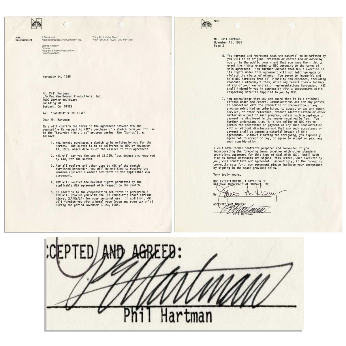 ''Saturday Night Live'' contract signed by the late comedian Phil Hartman, whose impersonations of Bill Clinton on SNL are considered among the show's best work. Contract is dated 14 November 1985, one year before Hartman became a series regular, for the purchase of an original sketch that Hartman wrote. Two page contract (on two sheets) is boldly signed ''PE Hartman'' at conclusion. Countersigned by a representative from NBC. 8.5'' x 11'' document is in near fine condition with staple holes to top left corner and hole punches at top.