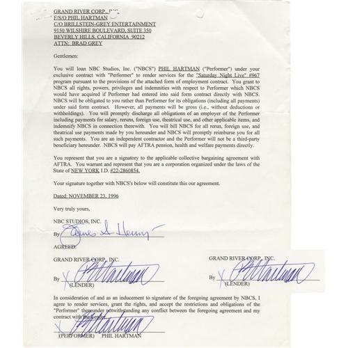 <B>Phil Hartman Signed "Saturday Night Live" Contract.</B></I> A single-page loan-out agreement between comedian Phil Hartman and NBC Studios dated November 23, 1996, engaging Hartman to appear as host of an episode of <I>Saturday Night Live,</B></I> signed by him twice in blue ink. Hartman had left the cast two years earlier after eight seasons on <I>SNL</B></I>; this was his second and last appearance as a guest host on the show before his untimely death in 1998. In Excellent condition with the usual staple and binder holes to the top edge.<I>Accompanied by LOA from PSA/DNA.</B></I><BR><BR><b>Shipping:</b> Flat Material, Small (<a target="_blank" href="http://www.heritageauctions.com/common/shipping.php">view shipping information</a>)