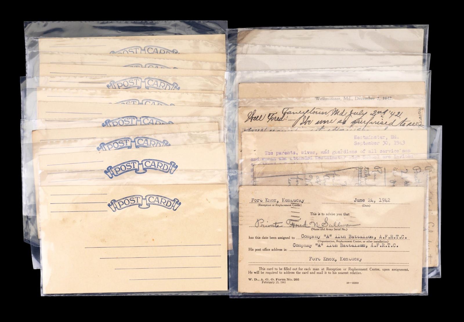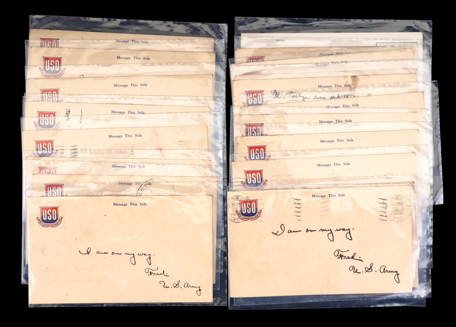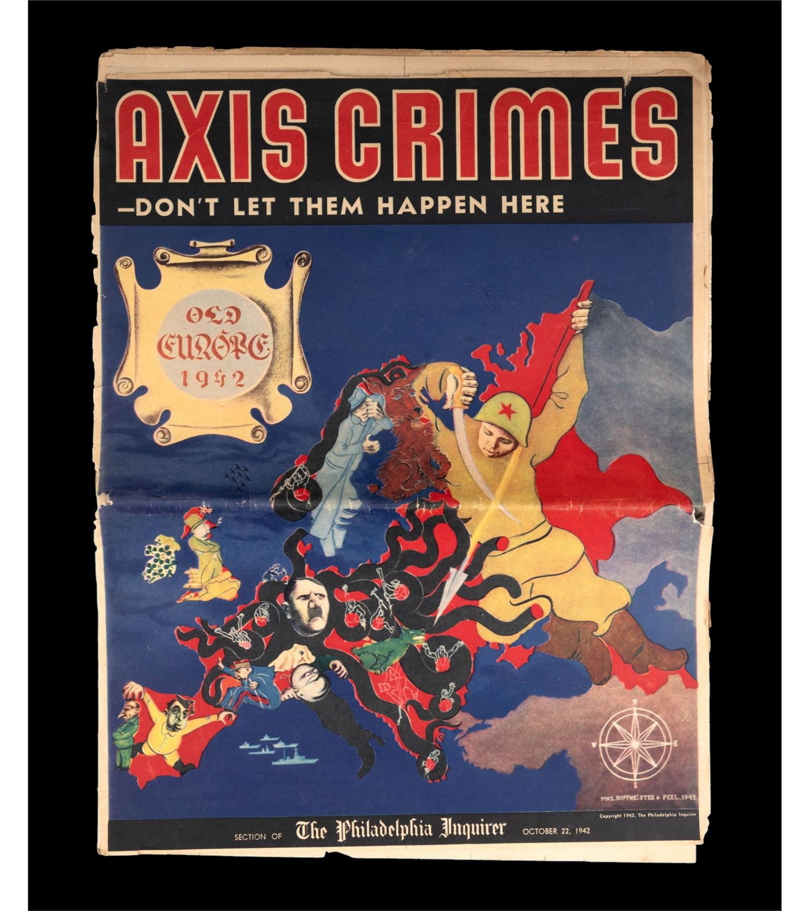 Philadelphia Inquirer "Axis Crimes Don't Let Them Happen Here" Old Europe 1942 authentic newspaper section, 3 U.S. Military advertisement post cards, 22 United Service Organization U.S. Military post cards. 15 other military post cards, & 10+ more pieces of vintage ephemera. Most post cards have written notes. See photos for further details.