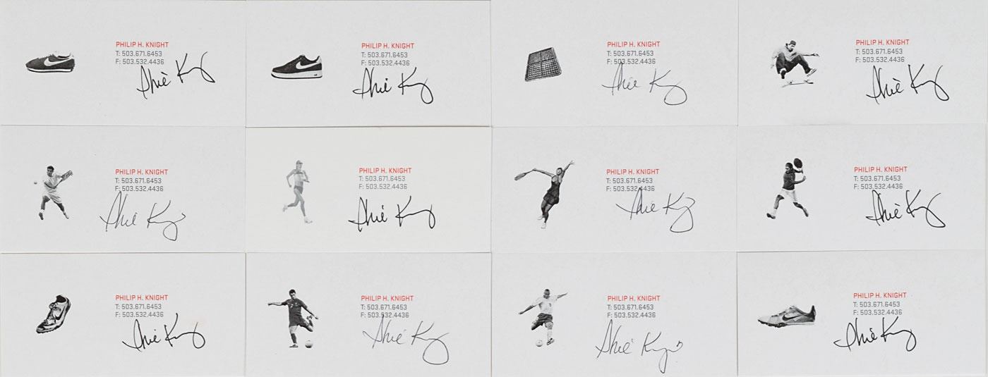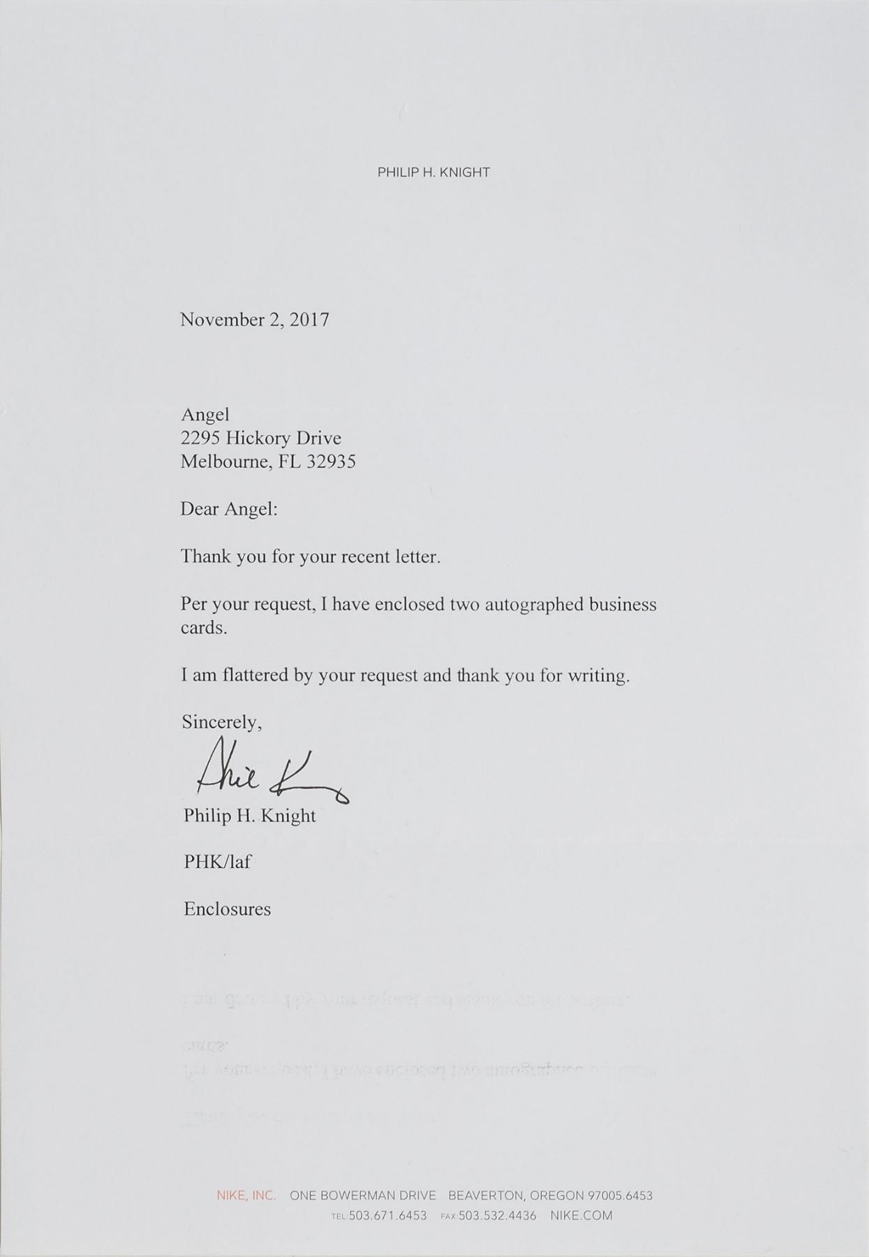 Set of 12 business cards belonging to Nike cofounder Phil Knight, 3.5 x 1.75, each signed in ink or ballpoint by Knight. Also is included is a TLS, one page, 7.25 x 10.5, November 2, 2017, personal letterhead, in which Knight forwards two "autographed business cards." In overall fine condition. Accompanied by the original mailing envelope.