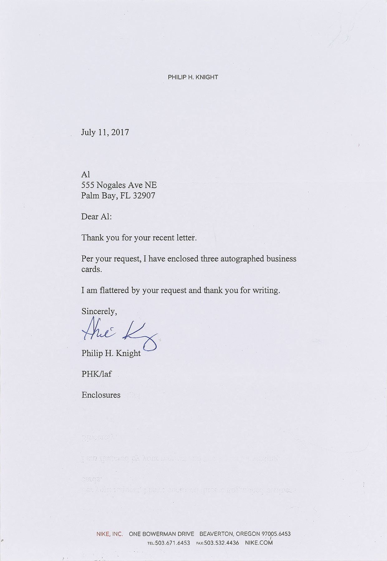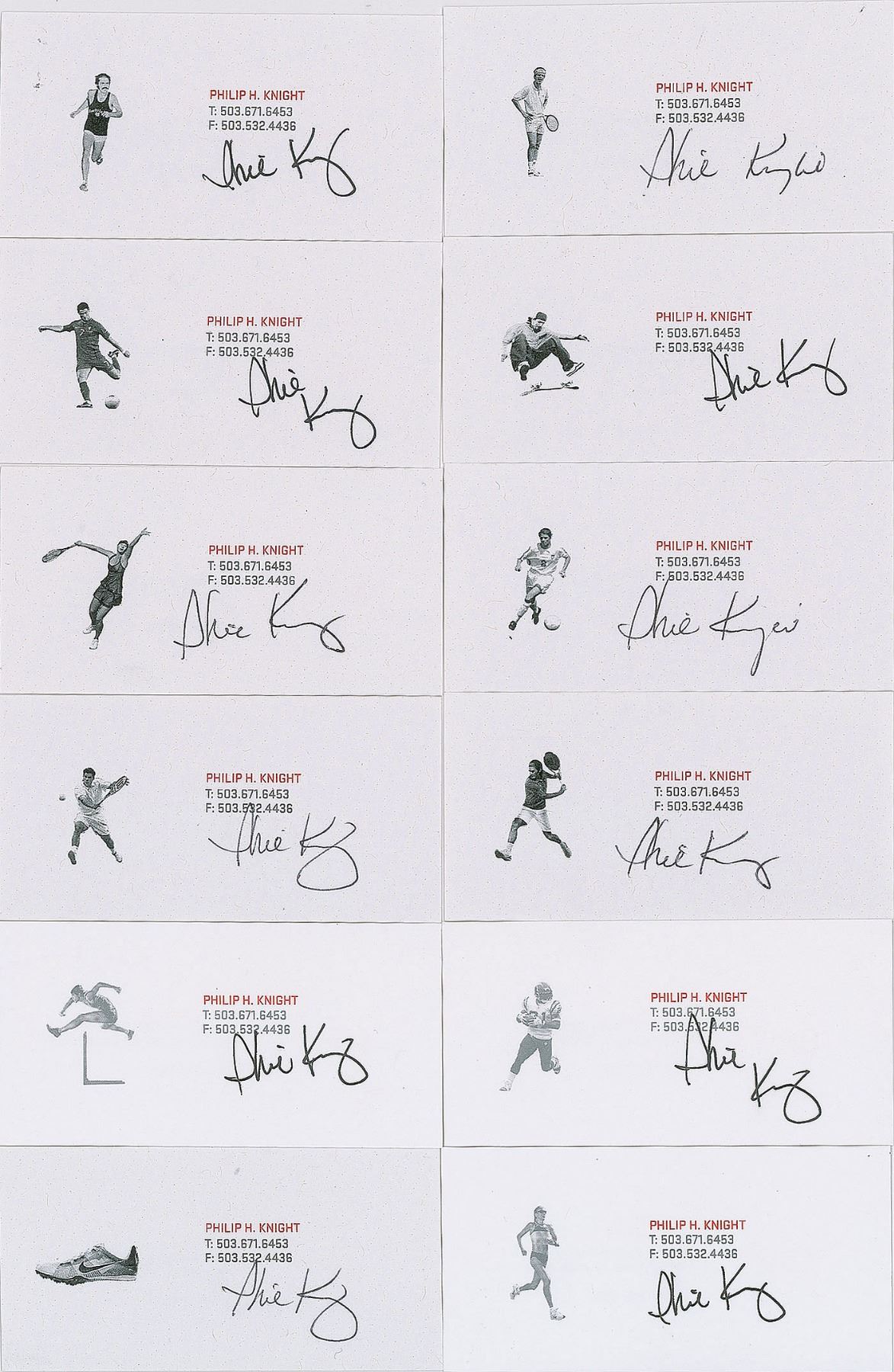Set of 12 business cards belonging to Nike cofounder Phil Knight, 3.5 x 1.75, each signed in ink or ballpoint by Knight. Also is included is a TLS, one page, 7.25 x 10.5, November 2, 2017, personal letterhead, in which Knight forwards three "autographed business cards." In overall fine condition. Accompanied by the original mailing envelope.