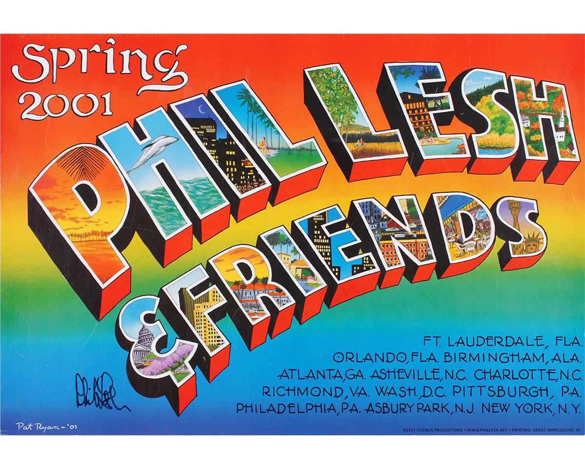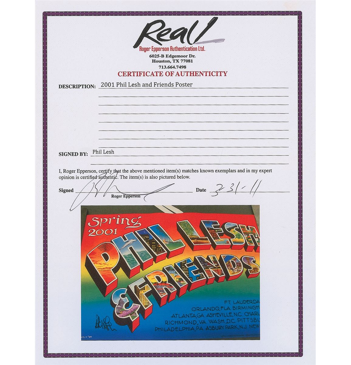 Two items: a black-bodied Harmonia telecaster-style electric guitar, signed on the white pickguard in black felt tip; and a colorful poster promoting a spring 2001 tour for Phil Lesh and Friends, 19 x 13, listing the various concert locations below, and signed in black felt tip. In overall fine condition, with a PSA/DNA authentication label affixed to pickguard, and the poster rolled. Accompanied by a certificate of authenticity from PSA/DNA for the guitar, and a full letter of authenticity from REAL for the poster. Oversized.