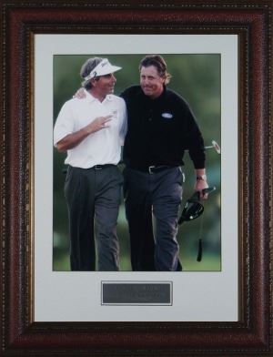 Phil Mickelson has won three major championships and reached a career high world ranking of 2nd in multiple years. He is nicknamed "Lefty" for his left-handed swing, even though he is otherwise right-handed. Fred Couples is a former World No. 1, he has won numerous events, most notably the Masters Tournament in 1992. This is a 11X14 unsigned photo of Phil Mickelson and Fred Couples. Custom Leather Framed and Matted.