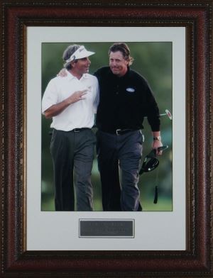 Phil Mickelson has won three major championships and reached a career high world ranking of 2nd in multiple years. He is nicknamed "Lefty" for his left-handed swing, even though he is otherwise right-handed.Fred Couples is a former World No. 1, he has won numerous events, most notably the Masters Tournament in 1992.This is a 16x20 unsigned photo of Phil Mickelson and Fred Couples. Custom Leather Framed and Matted.