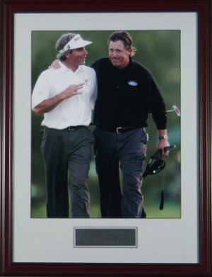 Phil Mickelson has won three major championships and reached a career high world ranking of 2nd in multiple years. He is nicknamed "Lefty" for his left-handed swing, even though he is otherwise right-handed. Fred Couples is a former World No. 1, he has won numerous events, most notably the Masters Tournament in 1992. This is a 8x10 unsigned photo of Phil Mickelson and Fred Couples. Custom Framed and Matted.