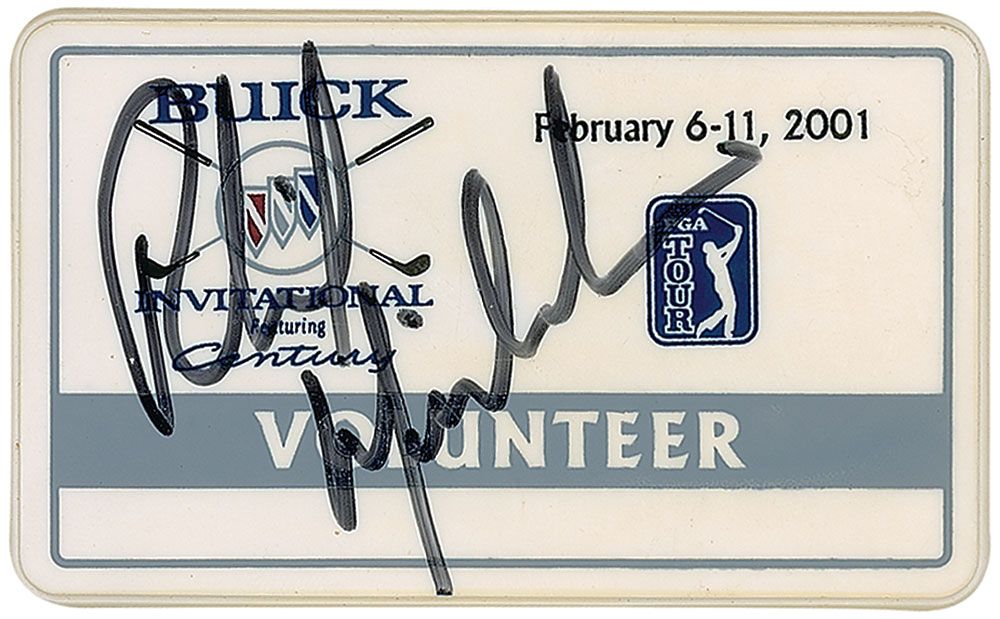 Pin-back volunteer tournament badge from the 2001 Buick Invitational, 3 x 2, signed on the front in black felt tip. In fine condition.