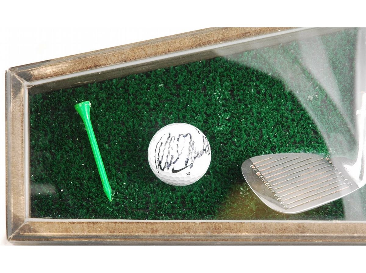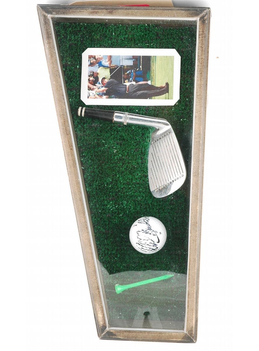 Box framed in 3D with grass background, encases a tee, a club head, a picture of Phil Mickleson mid swing, and an autographed golf ball. Collector's item for the golf lover! 7 3/4" x 14.5"