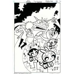 Phil Moy - Original Cover Art for Powerpuff Girls #3 (DC, 2000). The Powerpuff Girls are one of the most successful properties to enter the new millennium. Their "oh, so cute" appearance has made them a hit with every American youth. Buttercup, Blossom, and Bubbles are three tiny girls who right the wrongs of the world and still make it home for bedtime. This very clean cover exhibits Moy's perfect approach to the characters and has an exciting composition that contrasts nicely with the defeated look of the girls. The flat quality of the art coupled with the thick line work creates a surprisingly animated feel to the piece that appropriately emulates the television series. This artwork is in excellent condition and measures approximately 11.25" x 17". It is signed in the bottom margin by Phil Moy. Important notice: We expect to be auctioning lots at the rate of 200-250 per hour. Sometimes eBay Premier live bid software cannot keep up with that pace, so we strongly recommend that you place a realistic proxy bid now as insurance to avoid disappointment. Also please note that all Heritage/CAA lots purchased through eBay Premier carry a 20% Buyer's Premium. Please make sure you read the Terms and Conditions.
