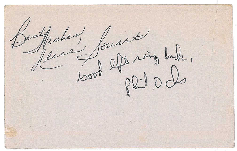 Ballpoint signatures of the folk singer-songwriters, “Good left wing luck, Phil Ochs” and “Best wishes, Alice Stuart,” on an off-white 5 x 3.25 card. A few small stains and creases, otherwise fine condition.
