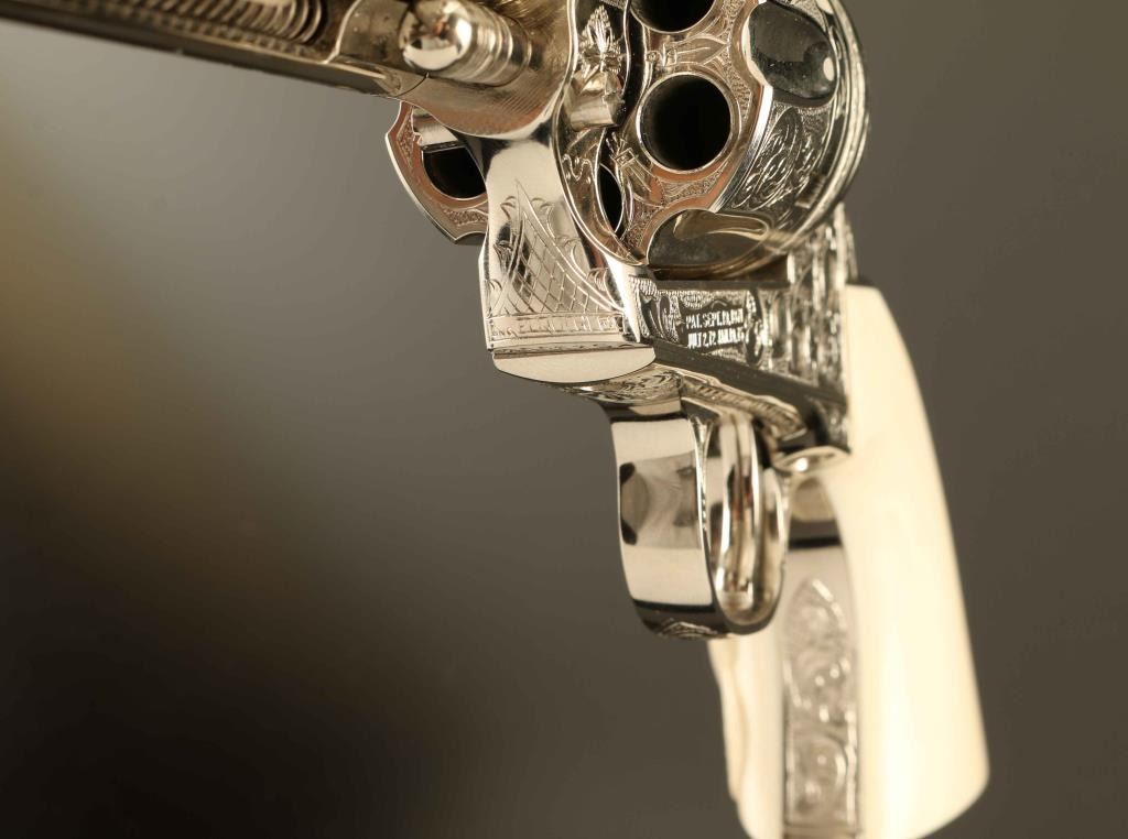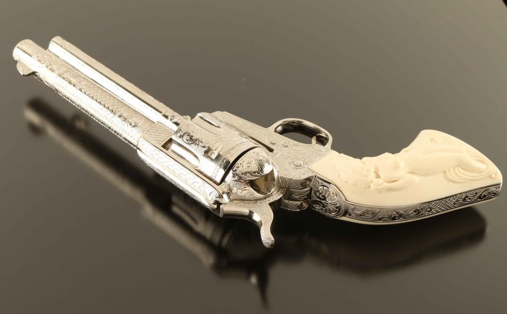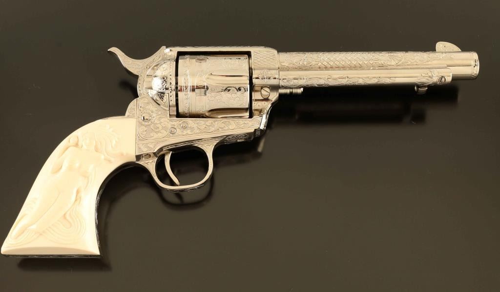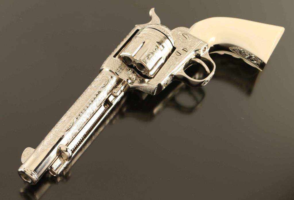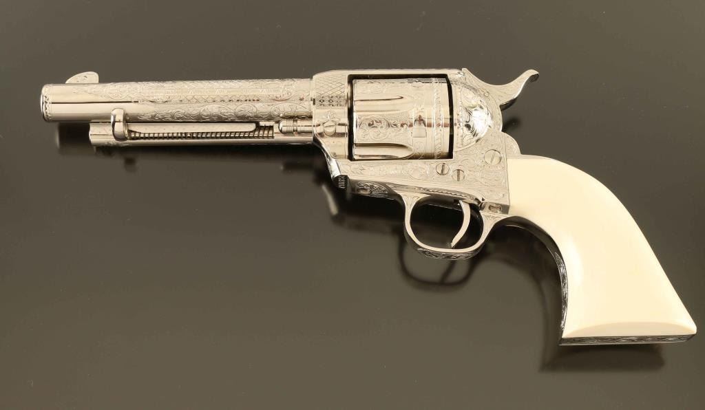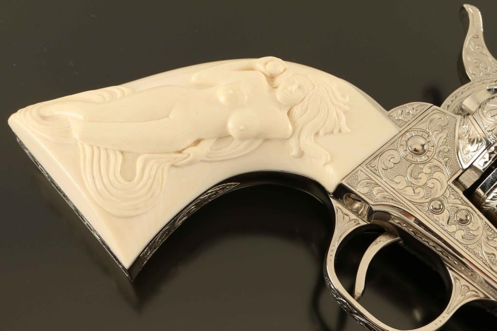 SN: 49982SA Magnificently engraved second generation single action revolver chambered in .357 Magnum, manufactured circa 1969. This revolver has been fully & finely engraved by Master Engraver Philip Quigley, with a design inspired by Ben Lane's masterpiece "Lucky Lady". Features a bright nickel plated finish, marvelous full coverage engraving with floral scroll, punch dot & checker board designs - signed by Mr. Quigley, 5 1/2" barrel, blade front sight, square notched rear sight, ejector rod, fluted six-shot cylinder, smooth trigger, knurled hammer spur and carved "Nude Eve with Apple" one-piece ivory grips by Paul Persinger. Revolver exhibits no visible wear. Action is crisp with very good lock-up, the bore is excellent and the ivory grips are fine. Condition is NRA Perfect. ***Modern Firearm***