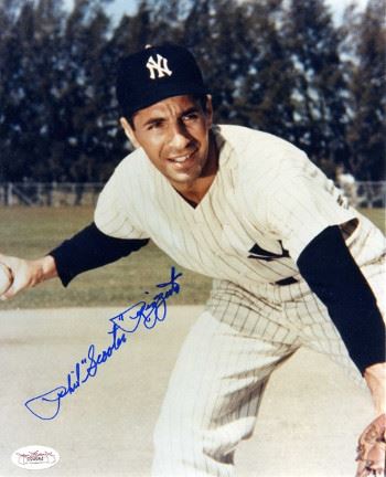 Phil Rizzuto, nicknamed "The Scooter", spent his entire 13-year baseball career for the New York Yankees. Rizzuto was elected to the National Baseball Hall of Fame in 1994. A popular figure on a team dynasty which captured 10 AL titles and seven World Championships in his 13 seasons, Rizzuto holds numerous World Series records for shortstops. He was well known for his trademark expression, "Holy Cow!". Phil Rizzuto (deceased) has hand signed this New York Yankees 8x10 Photo with Scooter inscription. JSA Hologram and Certificate of Authenticity.