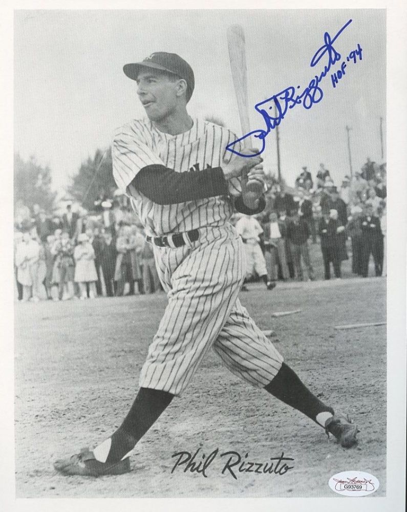 Hand-signed and inscribed in blue felt-tip pen by Phil Rizzuto (Yankees HOF D 2007). Autograph includes an official James Spence Authentication (JSA) hologram and matching COA for authenticity purposes.