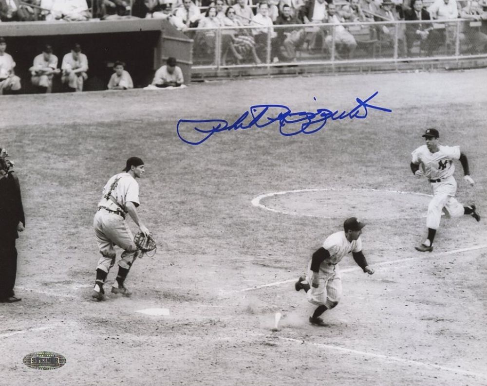 Hand-signed in blue felt tip pen by Phil Rizzuto (D 2007, HOF). Autographs include an official Steiner hologram for authenticity purposes.
