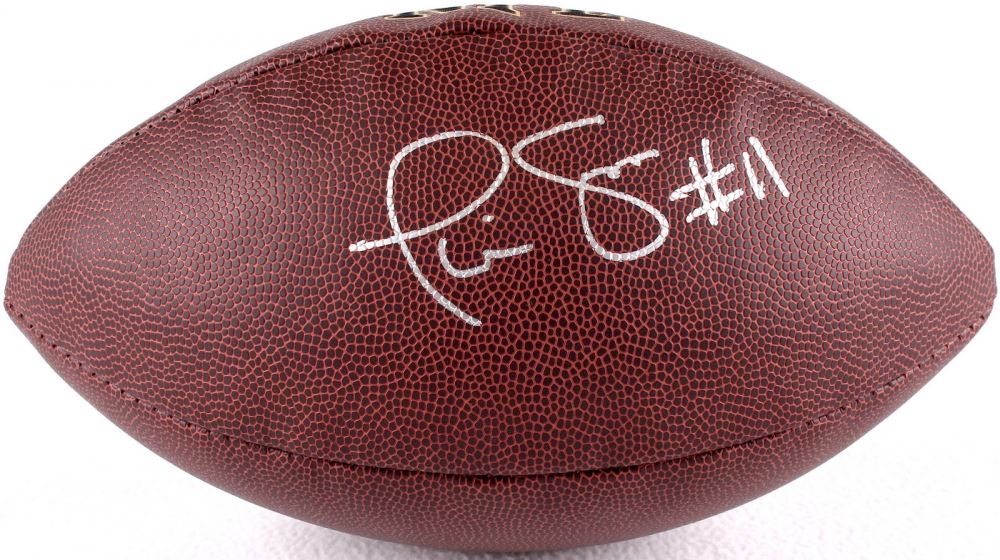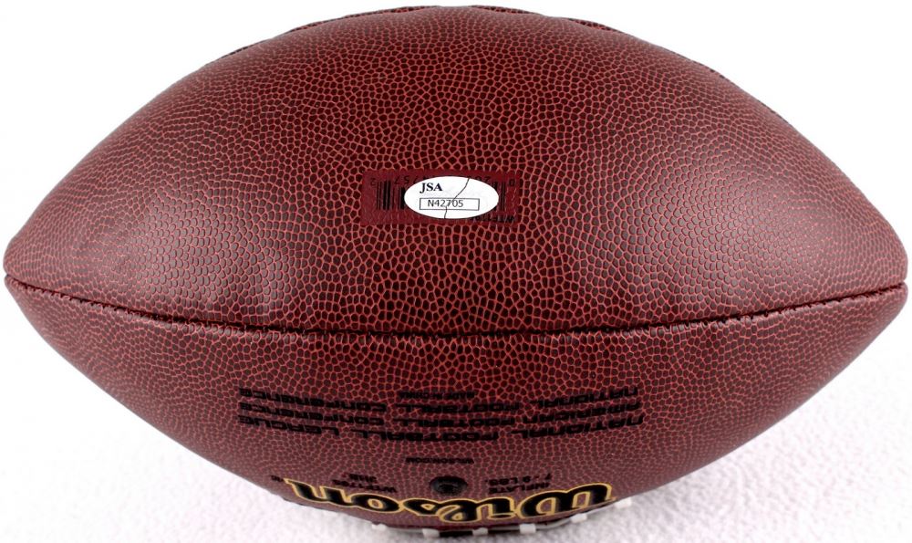 Wilson NFL football. Hand-signed in silver paint pen by Phil Simms (Giants). The autograph includes an official James Spence Authentication (JSA) hologram and matching COA for authenticity purposes. Please note, the hologram is torn.