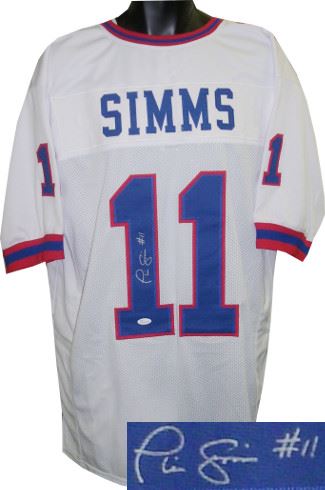 Phil Simms was one of the best quarterbacks in Giants history. Phil Simms led the Giants to two Super Bowl championships. On top of his 2 Super Bowl rings, Phil owns 19 team records. Simms owns the club record for the lowest career interception percentage and most passing touchdowns(184) in his career. Phil took home the Most Valuable Player award in Super Bowl XXI. Phil Simms New York Giants White Throwback unlicensed custom-prostyle jersey with twill stitched nameplate and numbers. JSA Hologram and Certificate of Authenticity from Athlon Sports.
