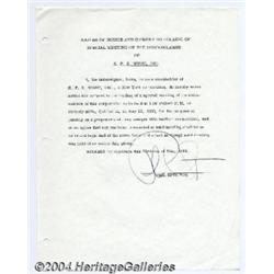 <B>Phil Spector - Signed Document (1966).</B></I> A one-page, 8.5" x 11" Waiver of Notice regarding a meeting of the stockholders of H.P.S. Music, Inc. Boldly signed in black ink, the page is in Fine condition. <I>Accompanied by COA from PSA/DNA. </B></I> <BR><BR><B>Important notice:</B> Heritage usually auctions material at the rate of 200-250 lots per hour. On some occasions eBay Live bid software or the Internet may not be able to keep up with the pace of the auction. We recommend placing a realistic absentee bid now as insurance to avoid disappointment. Occasionally the auctioneer may eliminate or reject an eBay Live bid, and the auctioneer may also reopen a lot after the close of the eBay live bidding (usually because we missed an audience bid), and may reject your bid even if it shows you as the winning bidder. By bidding via eBay Live, you agree that Heritage may award the lot to another bidder at its sole discretion under the circumstances described above or any other reasonable circumstances. Since eBay bids are not shown to us until we open the lot on the floor, we treat those bids just like floor bids. In most cases the floor responds before the eBay bid is presented to us, due to Internet lag time, so for consistency we have made it a policy that floor bids are always considered first over tie eBay live bids. Also please note that all Heritage lots purchased through eBay Live carry a 24.5% Buyer's Premium. Please make sure you read the Terms and Conditions before you bid.