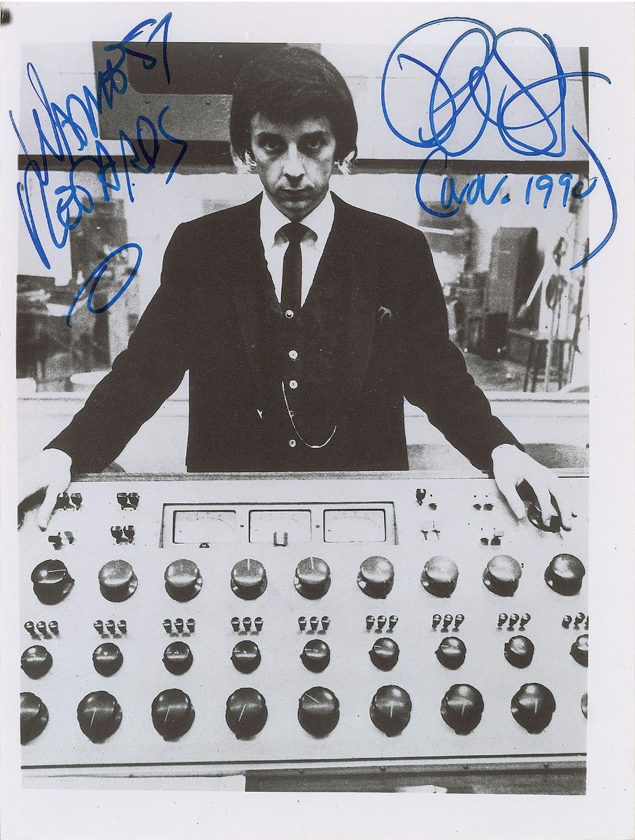 Glossy 8 x 10 portrait of Spector in studio, signed in person in blue felt tip, “Warmest Regards, Phil Spector (Nov. 1990).” In fine condition, with a slightly grainy quality to the image. Originally obtained by in-person specialist Mike Wehrmann.