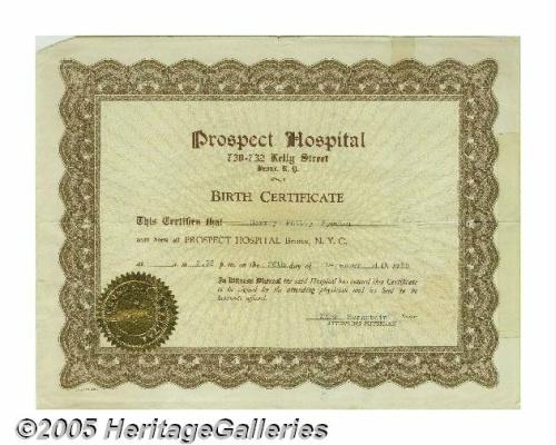 <B>Phil Spector's Birth Certificate- Prospect Hospital, Bronx 1939</B></I> In 1958, a group called the Teddy Bears had a major hit with "To Know Him Is to Love Him." Spector was songwriter, back-up singer, and guitarist for that group. They couldn't manage a follow-up and he left the group only to become one of the best known record producers ever. His trademark "Wall of Sound" arrangement style is instantly recognizable. Spector did work for the Crystals, the Ronettes, the Beatles, John Lennon, George Harrison, the Righteous Brothers, and many others. Here is his Birth Certificate from Prospect Hospital in the Bronx, New York certifying that Harvey Philip Spector was born at 2:55 PM on the 26th day of December, 1939 with Doctor Mark Hornstein attending. Folds and tape mends but still presents fine appearance.