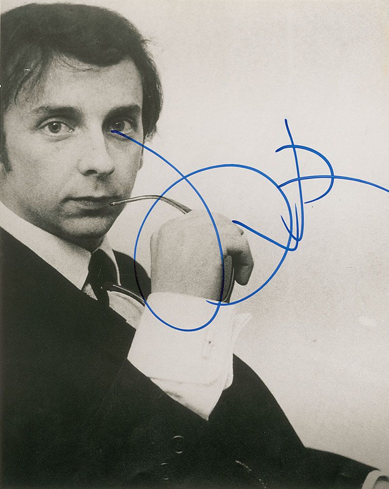 Satin-finish 8 x 10 photo of Spector holding his eyeglasses, signed in blue felt tip. In very fine condition.