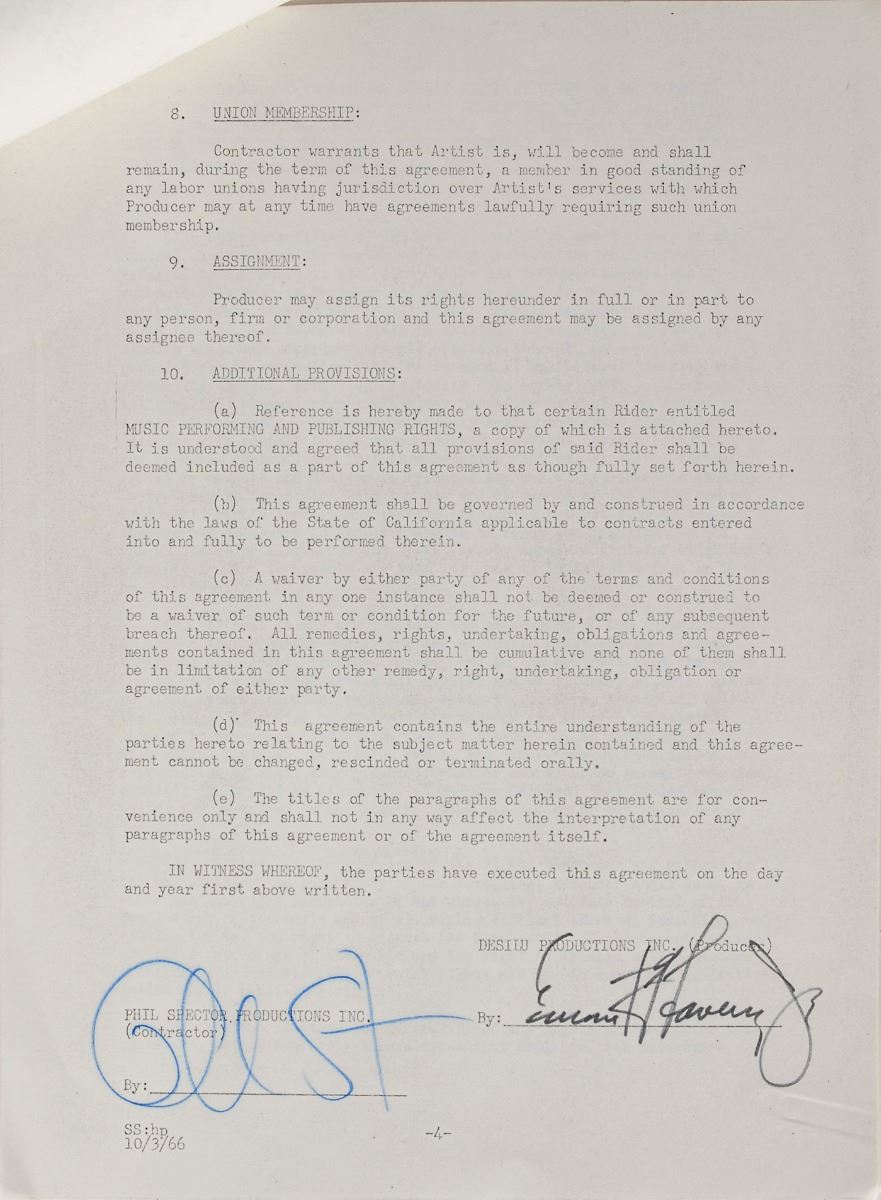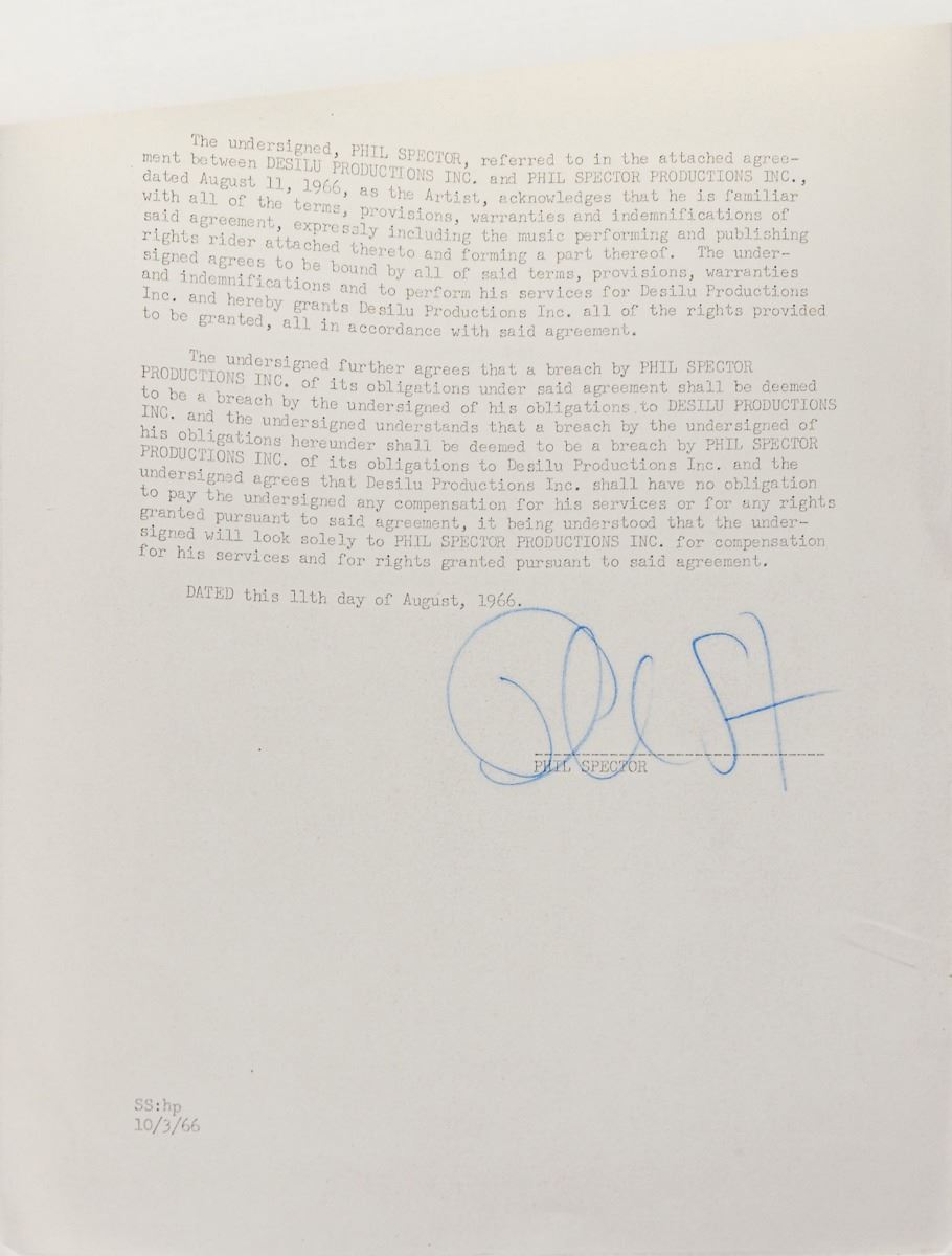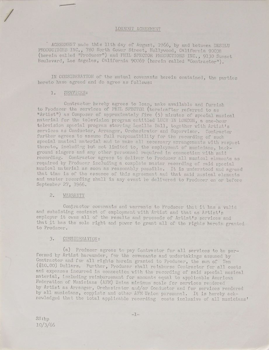 DS, ten pages, 8.5 x 11, August 11, 1966. Agreement between Spector and Desilu Productions in which Spector is hired as “Composer of approximately five (5) minutes of special musical material for the television program entitled Lucy in London, a one-hour television special program starring Lucille Ball.” Signed on the final page of the contract in felt tip by Spector and a Desilu producer, and also signed on the final page of the rider by Spector. In fine condition.