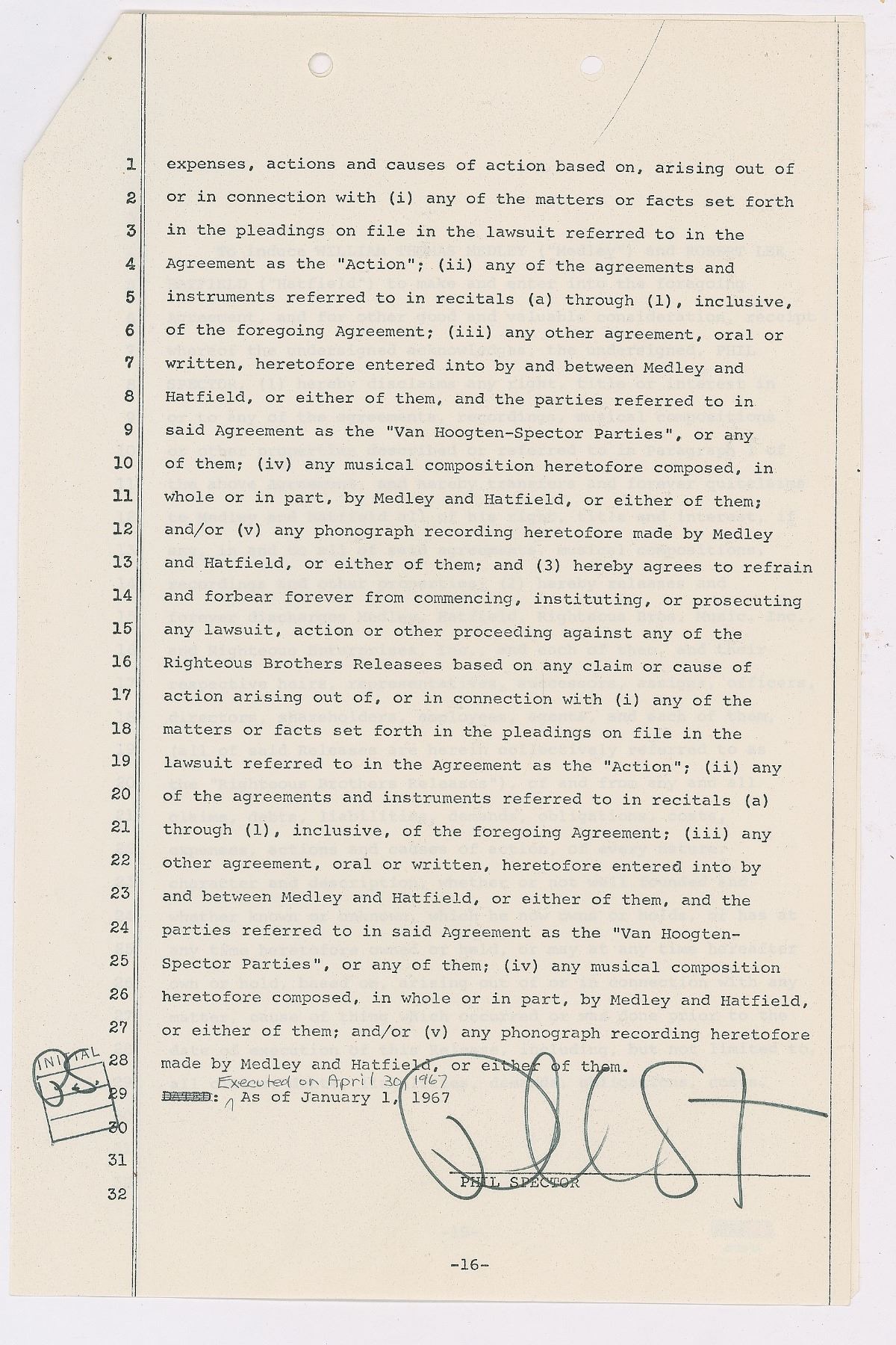 DS, two pages, 8.5 x 13, April 30, 1967. Document related to a foregoing agreement with the Righteous Brothers, with Phil Spector agreeing to disclaim rights, titles, or interest to "any of the agreements, recordings, musical compositions or other properties," and then hereby "releases and forever discharges Medley, Hatfield, Righteous Bros. Music, Inc., and Righteous Enterprises, Inc.," of all claims, debts, and liabilities. Signed and initialed at the conclusion in black felt tip by Spector. In fine condition. Accompanied by a certificate of authenticity from PSA/DNA.