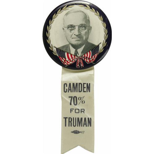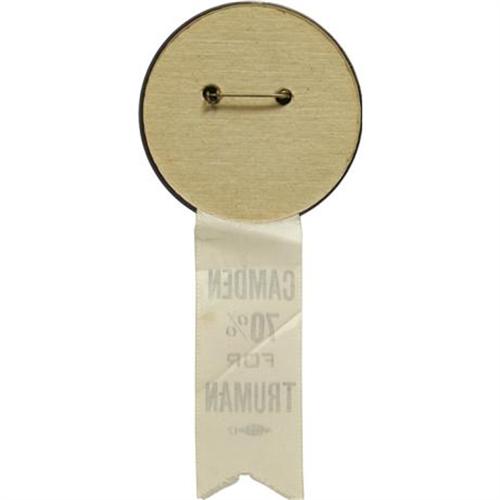 <B>Classic Large Philadelphia Badge Harry Truman Button, with Rare Camden, N.J. Ribbon.</B></I> This beautiful 3 1/2" button is highly-prized by collectors, and has seen steady appreciation over the years. However, to our knowledge, only several examples survive with this great blue/white ribbon celebrating Camden's contribution to Harry's upset 1948 election win. Beautiful condition save for one crease in the ribbon, requiring only a little ironing. Overall 3.5" x 7.5".