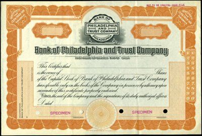 PA. 1920-1940. 1) Specimen. Philadelphia and Trust Company. < than 100 shs, orange. Bank logo. 2) Specimen. The Northeastern Title and Trust Co. Philadelphia, PA. Odd shs, Orange. Front of old bank building. 3) Specimen The Bryn Mawr Trust Company. Bryn Mawr, PA. < 100 shs, orange. Old bank building with old car in front. 4) The Northeastern Title and Trust Co. Philadelphia, PA. odd shs, green border, no vignette. Rare group of banking stocks. SBNC. Fine to XF.
