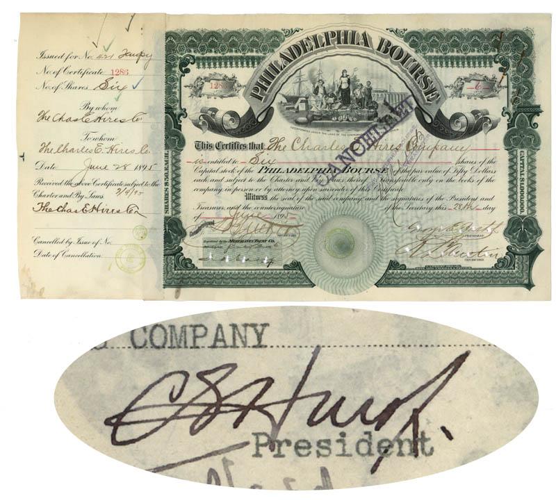 1895, Pennsylvania. Stock certificate for 6 shares issued to The Charles Hires Company and signed on verso by CHARLES HIRES, JR. . Green. Vignette of the Pennsylvania state seal flanked by a steam locomotive at right and sailing ship at left. Litho. This was a grain trading exchange. Punch cancellations do not affect Hire’s signature. Revenue stamps affixed with staples. Overall Fine.