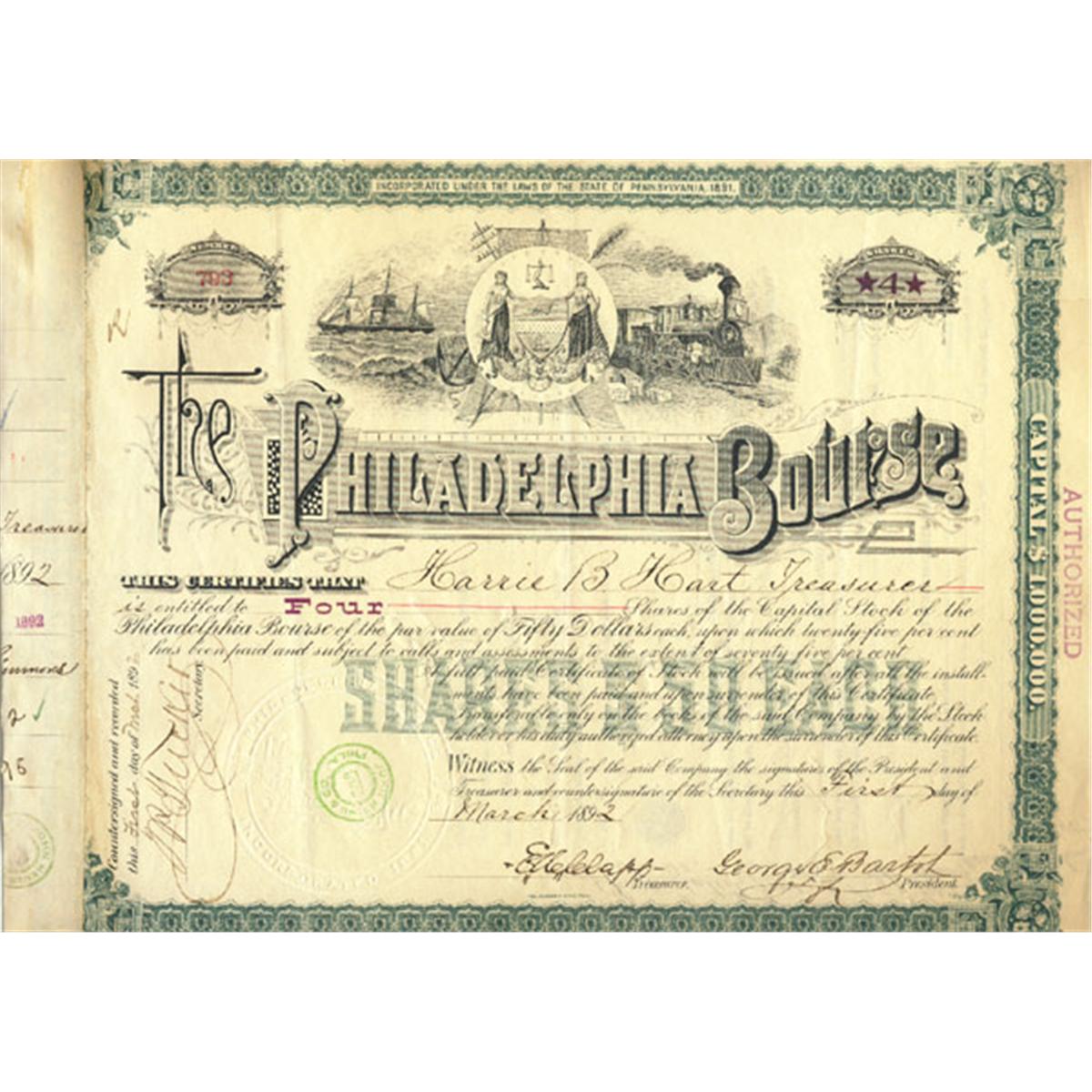 1892, Pennsylvania. Stock certificate for 4 shares. Green. Vignette of the Pennsylvania state seal flanked by a steam locomotive at right and sailing ship at left. Litho. This was a grain trading exchange. Lightly cut cancelled and very fine.(Early)