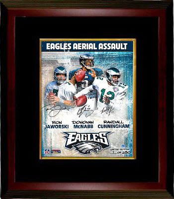 Ron Jaworski finished his 17 season career with 2,187 completions on 4,117 attempts for 28,190 yards, 179 touchdowns, and 164 interceptions. At one time he held the record for most consecutive starts by a quarterback with 116 having since been surpassed by Brett Favre and Peyton Manning. For his career, Donovan McNabb has led Philadelphia to 5 NFC East crowns, 5 NFC championship games and one Super Bowl appearance. Randall Cunningham was the Eagles' second-round pick in the 1985 NFL Draft. He was a 4 Time Pro Bowl selection and 4 Time All-Pro selection. This Philadelphia Eagles Aerial Assault 16x20 Photo has been hand signed by Ron Jaworski, Donovan McNabb & Randall Cunningham. Limited Edition of 250. Certificate of Authenticity from Athlon Sports Collectibles. Custom Black Mat and Premium Mahogany Color Framed as shown.