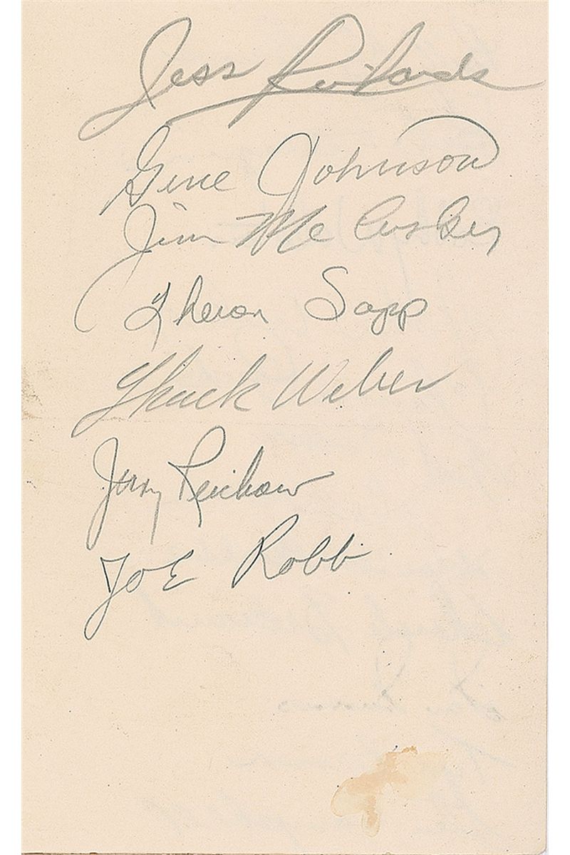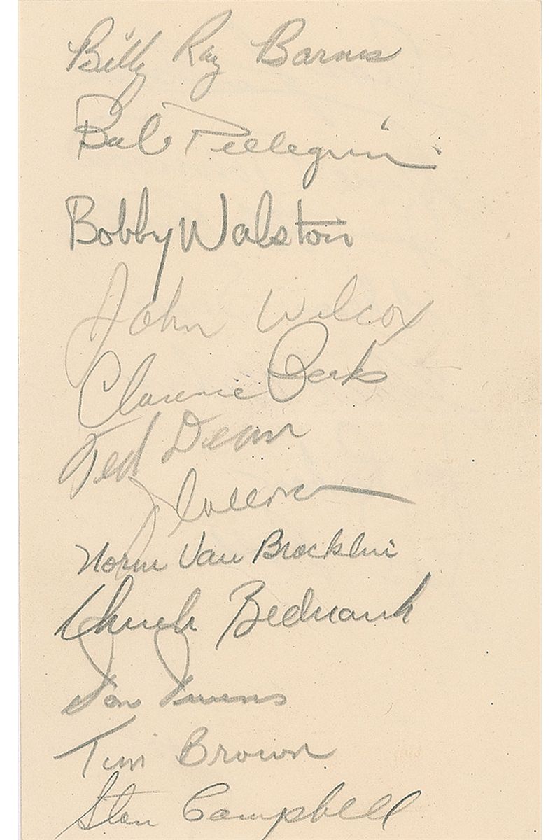 Vintage pencil signatures of 19 members of the 1960 NFL Champion Philadelphia Eagles on both sides of a 3.25 x 5.5 sheet. Signers include: Billy Ray Barnes, Bob Pellegrini, Bobby Watson, John Wilcox, Clarence Peaks, Ted Dean, Norm Van Brocklin, Chuck Bednarik, Don Owens, Tim Brown, Stan Campbell, Jess Richardson, Gene Johnson, Jim McCosker, Theron Sapp, Chuck Weber, Jerry Reichow, Joe Robb, and one other. In fine condition, with a central horizontal fold and a bit of mild soiling.