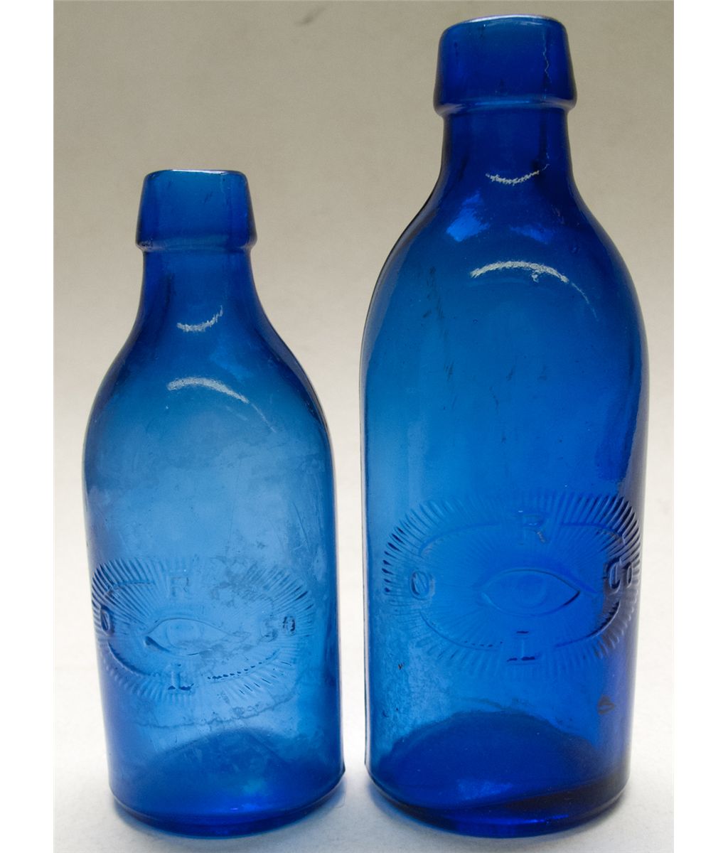 Small and medium size bottles of the set of three (5" and 5 3/4"). Really rare. Cobalt Blue. Embossed with an eye and R O L .
