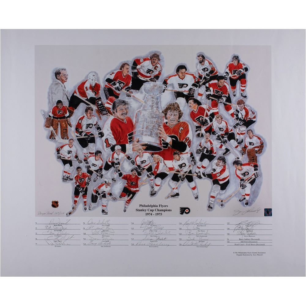 Limited edition color 30 x 24 print entitled 'Philadelphia Flyers, Stanley Cup Champions, 1974-1975,' numbered 107/125, which features Jerry Theirolf artwork of the legendary team, signed below in pencil by 23 Flyers, including: Bernie Parent, Bob Clarke, Bill Barber, Dave Schultz, Bob Kelly, Bill Clement, Joe Watson, Ed VanImpe, Tom Bladon, Andre Dupont, Don Saleski, Gary Dornhoefer, Terry Crisp, Simon Nolet, Ross Lonsberry, Rick MacLeish, Jim Watson, Larry Goodenough, Ted Harris, Orest Kindrachuk, Reggie Leach, Bob Taylor, and Wayne Stephenson. The print is also signed by the artist. Rolled and in fine condition, with a small tear to bottom edge and light creasing to right corners, all of which could be easily matted out.