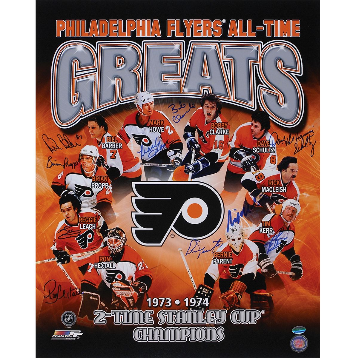 Color satin-finish 16 x 20 composite photo of ten Flyers legends, signed by all in blue felt tip. Signers are: Bobby Clarke, Dave Schultz, Rick MacLeish, Tim Kerr, Bernie Parent, Ron Hextall, Reggie Leach, Brian Propp, Bill Barber, and Mark Howe. In fine condition.